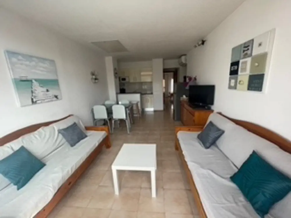 Situé à 100 mètres de la plage, l'appartement climatisé avec balcon vue piscine est composé d’une entrée, salon-séjour lumineux, cuisine aménagée et équipée (plaques vitrocéramiques, grand frigo, micro-ondes, lave-linge, lave-vaisselle, cafetière Dolce-Gusto). Deux chambres avec grands placards, salle de bain avec toilettes. Loggia et balcon.